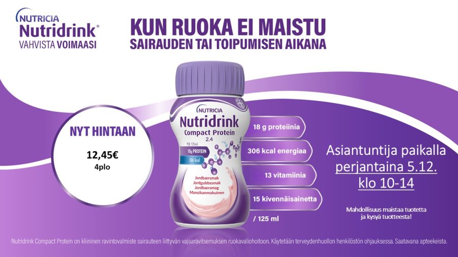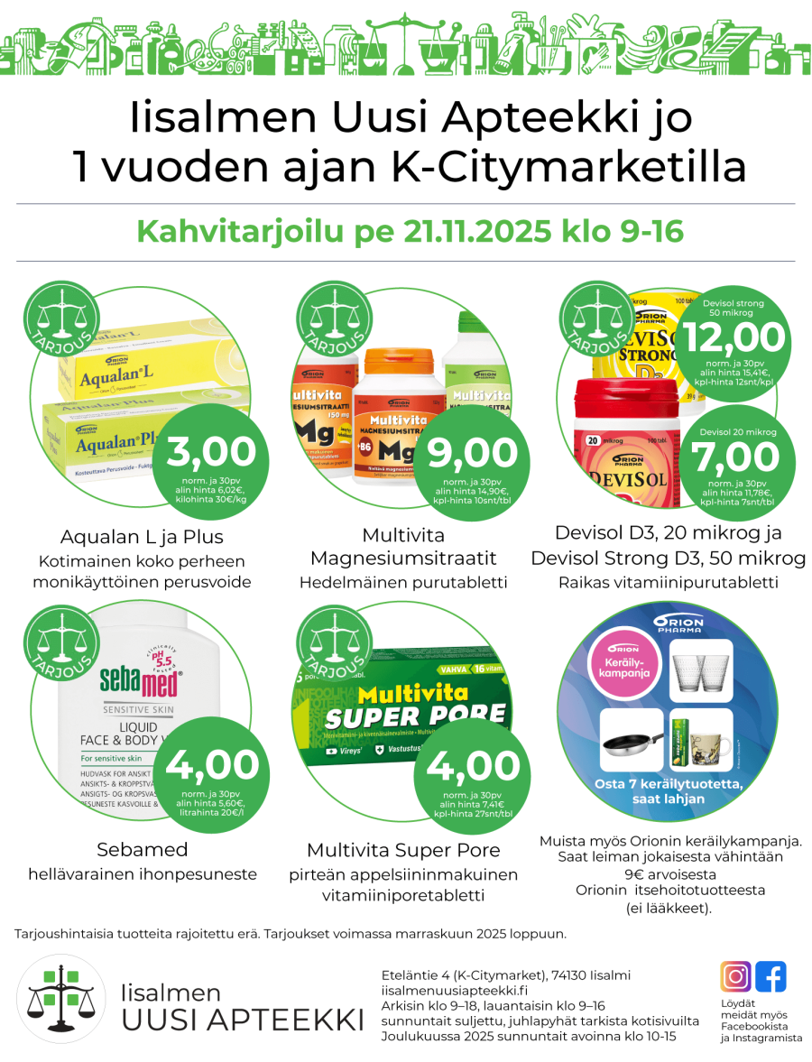 Apteekki palvelee joulukuussa 2025   ARKISIN klo 9-18 LAUANTAIT klo 9-16   Joulukuussa palvelemme myös:   Su 30.11. klo 10-15 Su 7.12. klo 10-15 Su 14.12. klo 10-15 Su 21.12. klo 10-15 Jouluaatto 24.12. klo 9-13 Joulupäivä 25.12. suljettu Tapaninpäivä 26.12. klo 10-15 Su 28.12. klo 10-15 Uudenvuoden aatto 31.12. norm. klo 9-18 Uudenvuoden päivä…